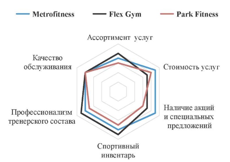 Конкурентный анализ по критериям «ассортимент предоставляемых услуг», «стоимость услуг», «наличие акций и специальных предложений», «спортивный инвентарь», «профессионализм тренерского состава», «качество обслуживания» показал, что имеется высокий конкурентный потенциал у каждой из анализируемых фитнес-организаций, незначительные отклонения в 1–3 балла из 10, в целом не выделяют какого-то одного лидера на рынке. Фрагмент многоугольника конкурентоспособности представлен на рис. 1.