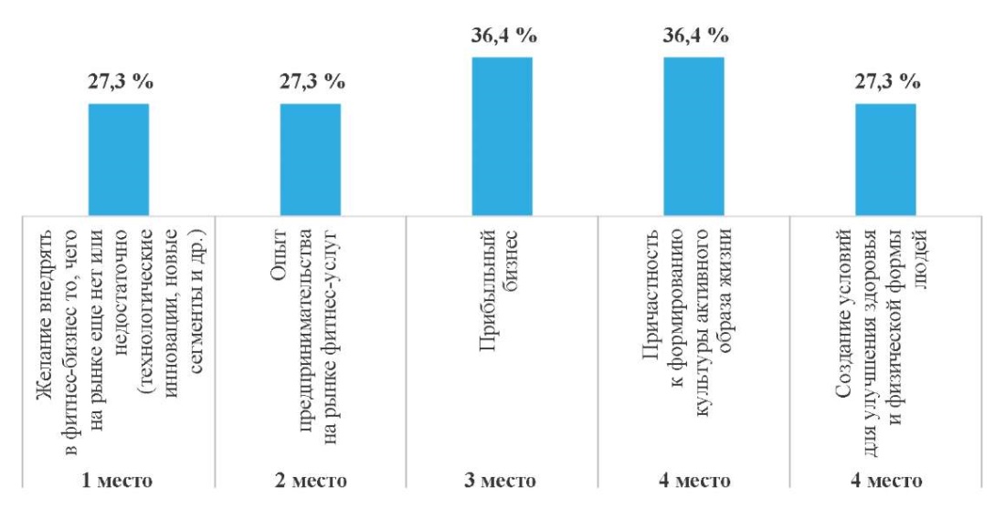 Интересным является результат анкетирования на вопрос руководителям фитнес-организаций: «Фитнес-индустрия для Вас – это… (расставьте приоритеты, где 1 – самый важный фактор, 5 – наименее важный фактор)». Ранжирование показало, что на первом месте почти у трети (27,3 %) респондентов желание внедрять в фитнес-бизнес то, чего на рынке еще нет или недостаточно (технологические инновации, новые сегменты и др.). Результаты опроса представлены на рис. 2.